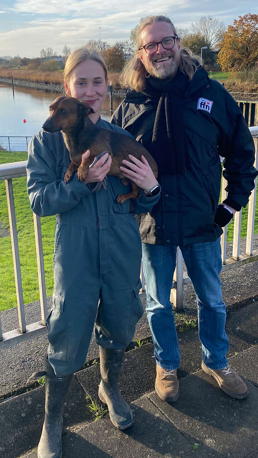 Am Ochtumsperrwerk in der Wesermarsch hat Axel Schäferin Annika und Dackel Igor getroffen und sie hat beim ersten grenzübergreifenden Quiz 300 Euro gewonnen